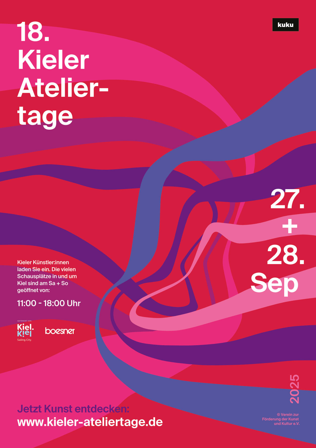 Wir sind dabei! Am 27. + 28. September 2025 finden die Kieler Ateliertage achtzehnten Mal statt – und auch der Kunstraum B ist dabei, diesmal nicht als Gastort, sondern zu Gast. Ihr findet und an dem Wochende während der Öffnungszeiten (11:00 bis 18:00 Uhr) im Atelier von Maren Koll, im Hof der Franckestraße 13.